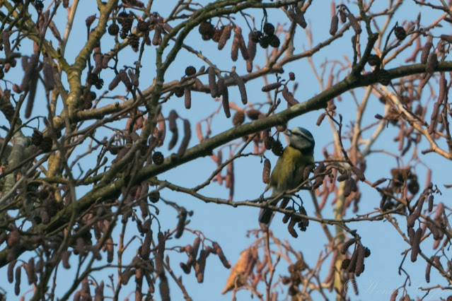 Further along the brook, I saw more Dunnocks, a few Chaffinches perched deep inside a huge Blackthorn bush and overhead, from time to time I would also hear the chatter of Goldfinches as they flew from treetop to treetop. Peering up into the Alder trees that the Goldfinches favour, I still couldn't see them, however, here and there Blue Tits were agilely feeding amongst the branches.